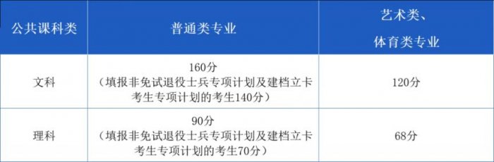 填报非免试退役士兵专项计划和建档立卡考生专项计划中艺术类、体育类专业的考生,其公共课合格线按照低线执行(即文科120分,理科68分)。